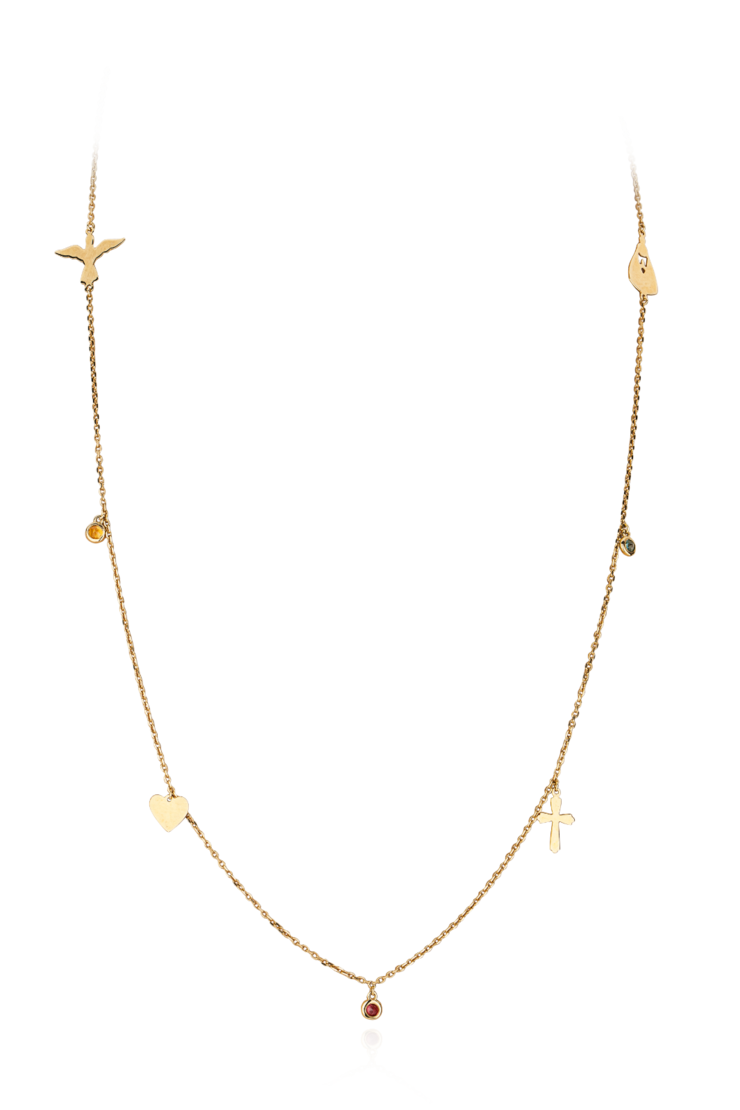 Gargantilha de 70 cm em ouro amarelo 18k, com rodolitas, ametistas lavanda, pingente em ágata de aprox. 4 cm e 15,6 g.